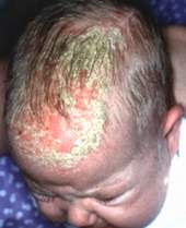-Vảy cứng từng mảng hoặc toàn bộ vùng đầu;