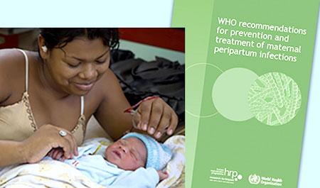 Các khuyến cáo của WHO trong phòng ngừa và điều trị các bệnh nhiễm trùng xung quanh thời điểm sinh đẻ của bà mẹ là củng cố nghiên cứu và bằng chứng về những can thiệp hiệu quả để giảm bớt gánh nặng trên toàn cầu do nhiễm khuẩn bà mẹ liên quan đến sinh con.WHO cung cấp hướng dẫn về thực hành tốt nhất cho việc sử dụng thường xuyên của các thủ thuật nhỏ (như cạo long vùng mu và khám âm đạo để đánh giá về tình trạng sinh đẻ), sử dụng các chất khử trùng khi sinh qua ngã âm đạo và mổ lấy thai, và việc sử dụng các loại thuốc kháng sinh như là một biện pháp phòng ngừa trong tình huống mà ở đó có một nguy cơ nhiễm trùng tiềm ẩn - như vỡ màng ối trước khi sinh, nước ối có phân su (khi phân đầu tiên của một trẻ sơ sinh được bắn vào trong nước ối), và nước té ra từ tầng sinh môn, cũng như các thủ thuật sản khoa như số tay hướng dẫn loại bỏ nhau thai, sinh ngã âm đạo (sử dụng kẹp hoặc hút chân không), cắt tầng sinh môn và mổ lấy thai. Khuyến cáo về điều trị bao gồm một sự tập trung vào việc sử dụng thuốc kháng sinh do viêm màng ối (viêm màng thai do nhiễm vi khuẩn) và viêm nội mạc tử cung sau sinh (một tình trạng viêm nội mạc tử cung, lớp lót bên trong tử cung).