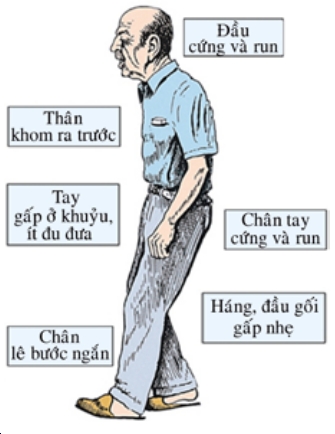 Tăng trương lực cơ ngoại tháp gây ra hiện tượng “cứng kiểu ống chì hay uốn sáp”. Khi vận động thụ động, dấu hiệu cứng thường kèm dấu hiệu “bánh xe răng cưa”: khi làm động tác duỗi, thầy thuốc cảm nhận hiện tượng duỗi xảy ra từng nấc chứ không liên tục. Tư thế gấp do tăng phản xạ tư thế quá mức là hiện tượng tăng trương lực cơ thuộc nhóm cơ gấp chiếm ưu thế tạo nên dáng người hơi gấp về phía trước. Lúc đầu gấp ở khuỷu tay. Giai đoạn sau, đầu và thân chúi ra trước, chi trên gấp và khép, chi dưới gấp ít hơn. Phản xạ điều chỉnh tư thế giảm nên bệnh nhân dễ bị ngã “như cây chuối đổ” khi bị đẩy nhẹ từ trước ra sau. Ở giai đoạn muộn, có dấu hiệu “đông cứng”. Mỗi lần bắt đầu ngồi dậy, hoặc đi, người bệnh rất khó cử động. Hiện tượng này có thể xuất hiện trong tất cả các hoạt động trong ngày như nói, viết làm ảnh hưởng nhiều tới cuộc sống hàng ngày của bệnh nhân. Ngã là hậu quả của sự rối loạn thăng bằng và điều phối các cơ trục thân thể, rối loạn phản xạ tư thế. Hậu quả của ngã có thể làm gãy xương khiến bệnh nhân liệt giường.