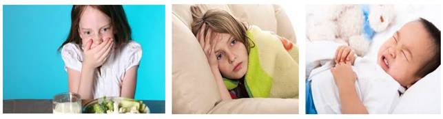 - Viêm dạ dày ruột và ngộ độc thức ăn: rất khó phân biệt bệnh viêm dạ dày ruột do virút/ vi khuẩn với ngộ độc thức ăn vì khởi phát bệnh khá giống nhau, ví dụ như trẻ có thể nôn ồ ạt 5-30 phút/ lần trong 1-12 giờ đầu. Tuy nhiên, cũng có một số dấu hiệu để phân biệt 2 loại bệnh này: Nếu bị nhiễm virút, bệnh khởi phát đột ngột, trẻ nôn, sốt cao và đau bụng. Tình trạng nôn có thể kéo dài 12-72 giờ (3 ngày). Tiêu chảy thường xuất hiện trong ngày đầu hoặc ngày thứ hai.Nếu bị ngộ độc thức ăn, bệnh khởi phát 2-12 giờ sau khi ăn phải thực phẩm kém chất lượng. Trẻ thường không sốt. Nôn xuất hiện vài giờ sau khi ăn tại nhà hàng hay khi đi dã ngoại và thường không kéo dài quá 12 giờ. Có thể có hoặc không có tiêu chảy. Nếu trẻ sốt cao hoặc nôn kéo dài hơn 12 giờ thì ít khả năng là ngộ độc thực phẩm.