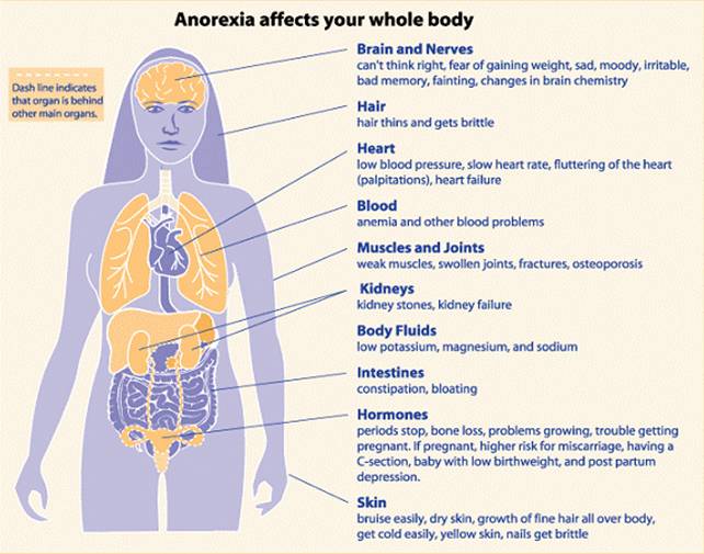 Biếng ăn ở độ tuổi này còn khiến cơ thể không được hấp thu, nhận đủ dinh dưỡng thiết yếu để nuôi dưỡng cơ thể và ngăn cản sự tấn công của bệnh tật cũng như quá trình lão hóa tự nhiên. Chức năng của hàng loạt các bộ phận cơ quan trong cơ thể bị tác động, suy yếu như giảm sức mạnh ở cơ, tim mạch, hệ nội tiết, phổi, tụy, chức năng nhận thức. Như vậy, sẽ làm tăng nguy cơ mắc các bệnh truyền nhiễm, bệnh mãn tính, thúc đẩy gia tăng tốc độ quá trình lão hóa nhanh. Cũng theo kết quả thống kê, hậu quả của căn bệnh này đối với sức khỏe bệnh nhân là rất nghiêm trọng. Có khoảng 10% người mắc chứng chán ăn tử vong vì căn bệnh này và 30% sẽ mắc căn bệnh này mãn tính. Điều đó có nghĩa là những người này sẽ phải sống suốt đời trong tình trạng thiếu cân gầy yếu. Phụ nữ mắc chứng chán ăn mãn tính có nguy cơ không thể có con, xương yếu, rụng tóc. Căn bệnh này cũng để lại hậu quả nghiêm trọng đối với sức khỏe tinh thần. Nó sẽ tạo ra một vòng luẩn quẩn :kiệt sức gây ra trầm uất, trầm uất càng làm cho cơ thể kiệt sức. Rất nhiều người đã không thể ra khỏi vòng luẩn quẩn này khi họ phải chịu đựng nó quá lâu.