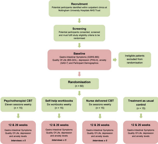 Đối với việc cung cấp các phiên trị liệu tâm lý, nhóm nghiên cứu tuyển dụng các nhà tâm lý học đã được đào tạo về liệu pháp tâm lý, áp dụng các kỹ thuật hình dung tích cực, cung cấp các đề xuất về việc kiểm soát cơn đau và khó chịu. Bên cạnh việc đến gặp bác sĩ chuyên khoa, bệnh nhân được cung cấp đĩa CD có chứa các tài liệu cho phép họ thực hành các kỹ thuật tự thôi miên 15-20 phút mỗi ngày. Các nhà nghiên cứu yêu cầu những người tham gia điền vào bảng câu hỏi đánh giá các yếu tố khác nhau liên quan đến nghiên cứu, bao gồm mức độ nghiêm trọng của các triệu chứng IBS, chất lượng cuộc sống, số tiền họ chi cho chăm sóc sức khỏe và tần suất họ phải bỏ lỡ công việc do tình trạng này. Các nhà khoa học nhận thấy rằng những người bị IBS đã tham gia liệu pháp tâm lý - dù là cá nhân hay theo nhóm, có mức độ giảm triệu chứng thỏa đáng nhất so với những người chỉ tham gia trong nhóm chăm sóc hỗ trợ.