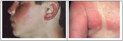 Đỏ da toàn thân là một phản ứng dị ứng của cơ thể xảy ra khi dùng các loại thuốc như penicilline, ampicilline, streptomycine, sulfamide, chloramphenicol, tetracycline; các thuốc an thần, giảm đau, hạ sốt... Dấu hiệu dị ứng xuất hiện từ 2 đến 3 ngày, trung bình từ 6 đến 7 ngày; đôi khi từ 2 đến 3 tuần sau khi dùng thuốc. Bệnh nhân thấy ngứa khắp người, sốt cao, rối loạn tiêu hóa, nổi ban và tiến triển thành đỏ da toàn thân. Trên da có vảy trắng, kích thước không đều, có thể nhỏ bằng hạt phấn đến to bằng hạt dưa; các kẽ tay chân có thể bị nứt và chảy nước vàng, đôi khi bị bội nhiễm và có mủ.