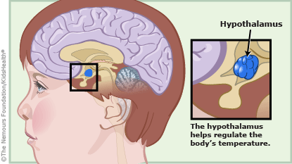 Hệ thần kinh luôn luôn chuyển tới cấu tạo này tình trạng nóng lạnh ở các vùng khác nhau của cơ thể. Cơ quan sẽ kích thích các phản ứng để tăng hoặc giảm nhiệt độ cơ thể. Chẳng hạn tăng hoặc giảm máu ấm từ trung tâm cơ thể ra ngoại vi mát lạnh; tăng hoặc giảm sự chuyển hóa thực phẩm ra năng lượng; tăng bốc hơi qua đổ mồ hôi. Khi thân nhiệt xuống thấp, bộ phận này sẽ ra lệnh cho cơ thể làm một động tác nào đó, như co giật, run các cơ để tạo ra nhiệt. Ngược lại khi thân nhiệt cao, các tuyến mồ hôi được não kích thích để ra nhiều mồ hôi và hạ nhiệt độ. Đôi khi vùng dưới đồi“tái phối trí” thân nhiệt cao hơn để đáp ứng với bệnh tật, nhiễm khuẩn hoặc các nguyên nhân khác. Theo các nhà nghiên cứu, nâng cao thân nhiệt là một phương thức của cơ thể để chống cự và hủy diệt tác nhân gây bệnh. Cần lưu ý tới sự thay đổi nhiệt độ bình thường ở người cao tuổi và trẻ thơ. Họ đều dễ dàng thất thoát nhiệt độ khi tiếp xúc với khí hậu lạnh và đưa tới hạ thân nhiệt. Ở lớp tuổi này, nhiều khi dù đã bị nhiễm trùng mà nhiệt độ chưa tăng, cho nên khi tìm ra bệnh thì quá trễ. Nhiều người thường lấy bàn tay sờ lên trán coi có nóng sốt hay không. Đây cũng là phương thức thực tế, nhưng không chính xác. Do đó, nên dùng các loại nhiệt kế để đo nhiệt độ. Mỗi phần của cơ thể có nhiệt độ khác nhau. Miệng là nơi thường được dùng để đo nhiệt độ, nhiệt độ miệng giảm khi ăn uống món ăn lạnh hoặc khi bị kích xúc, tăng khi ăn thực phẩm nóng, miệng nhai, hút thuốc lá hoặc có nhiều nước miếng.