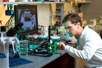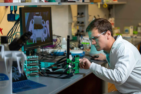 Sinh viên nghiên cứu sau đại học chuyên ngành kỹ thuật sinh học Kevin Janson đã kết hợp da nhân tạo in 3D, máy ảnh tự động và phần mềm học máy để loại bỏ nhu cầu sử dụng tình nguyện viên và tăng tốc quá trình thu thập và xử lý dữ liệu trong các nghiên cứu về hành vi đốt mồi của muỗi. (Ảnh chụp bởi Brandon Martin / Đại học Rice)