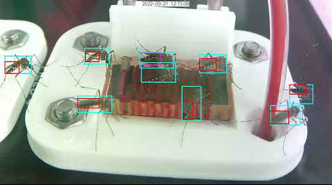 Các kỹ sư sinh học của Đại học Rice đã hợp tác với các chuyên gia y học nhiệt đới từ Đại học Tulane để tạo ra một công cụ công nghệ cao để nghiên cứu hành vi đốt mồi của muỗi, sử dụng miếng hydrogel được dẫn máu vào tạo ra từ máy in 3D như là da nhân tạo (ảnhtrên) và kết hợp với máy ảnh tự động và phần mềm học máy (ảnh dưới) để tăng tốc việc thu thập và xử lý dữ liệu (Hình minh họa do K. Janson / Đại học Rice cung cấp).