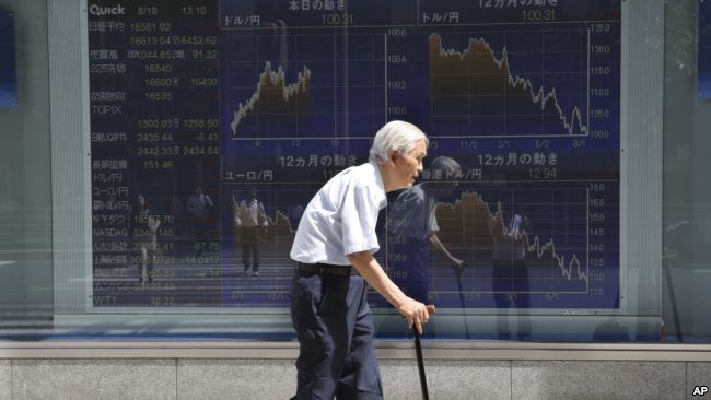 Một người đàn ông lớn tuổi đi ngang qua sàn chứng khoán điện tử của một công ty chứng khoán Tokyo,