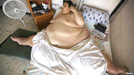 Manuel Uribe, từng được biết đến là người đàn ông nặng nhất thế giới, nói chuyện trên điện thoại tại nhà riêng ở ngoại ô San Nicolas de los Garza, ở Monterrey, Mexico, ngày 8/8/2008 |